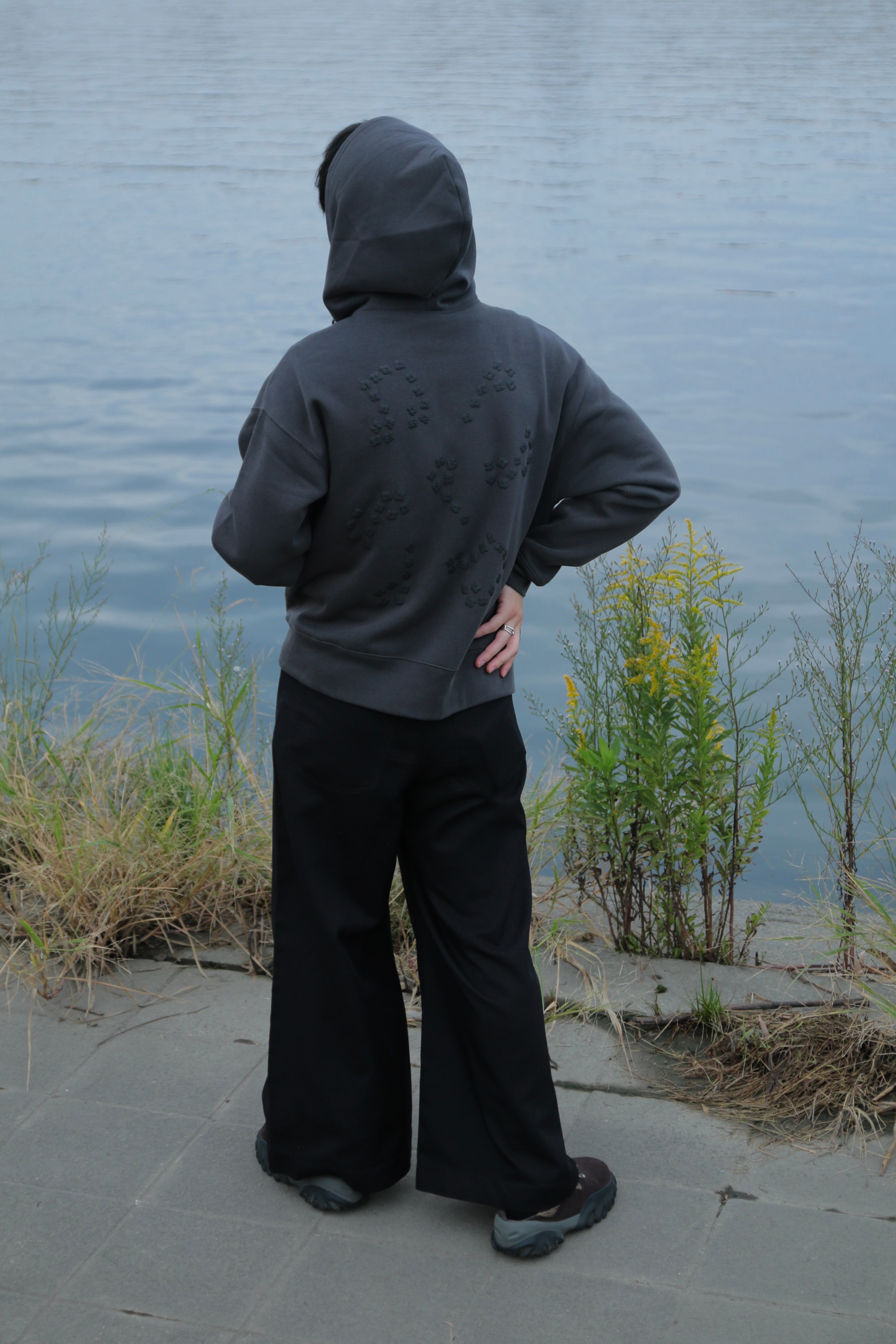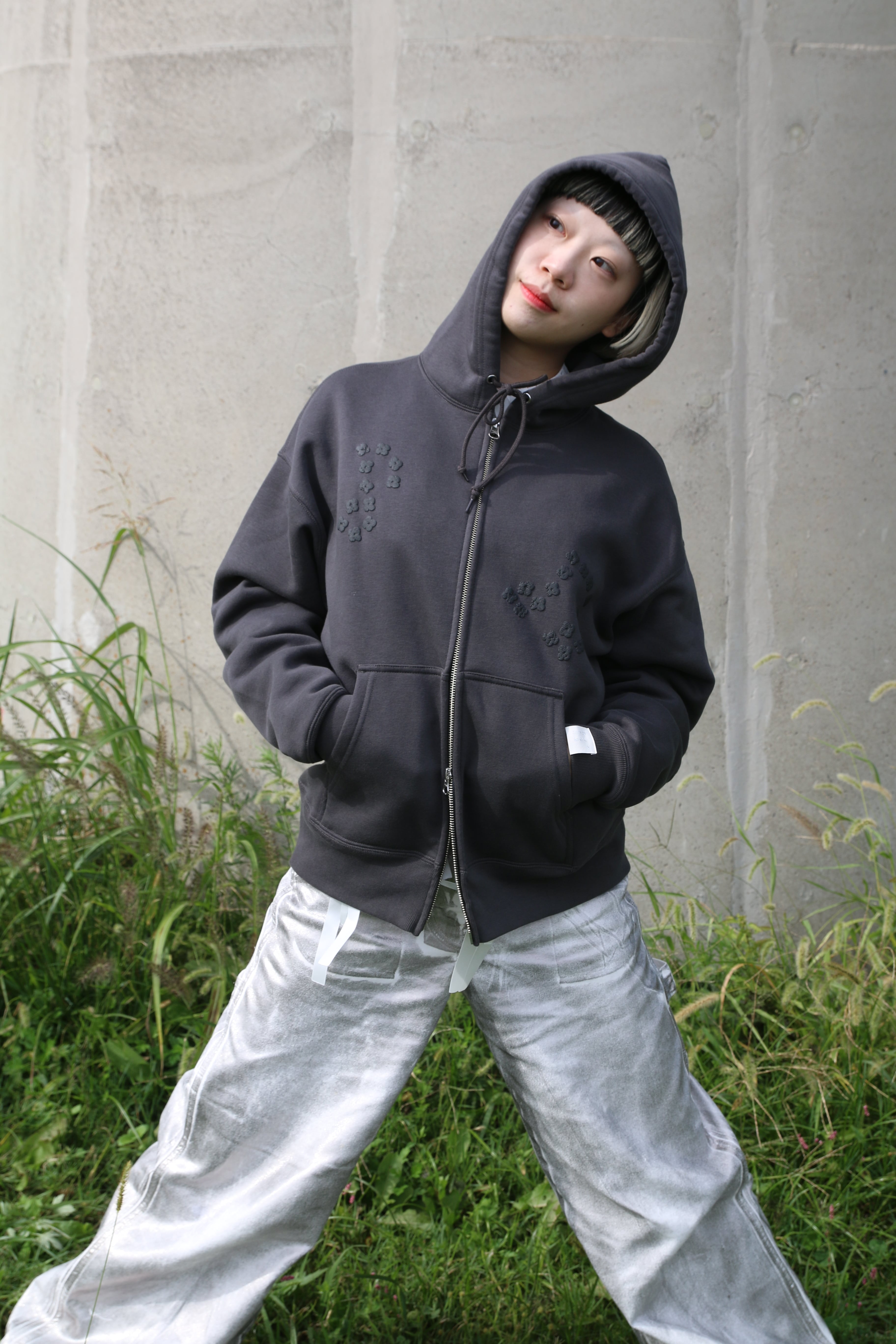 ボディは、ふっくらとした裏起毛が心地よいダブルジップのフーディー。カジュアルにも上品にも馴染み、デニムやスカートなど幅広いスタイルに合わせやすい1枚です。