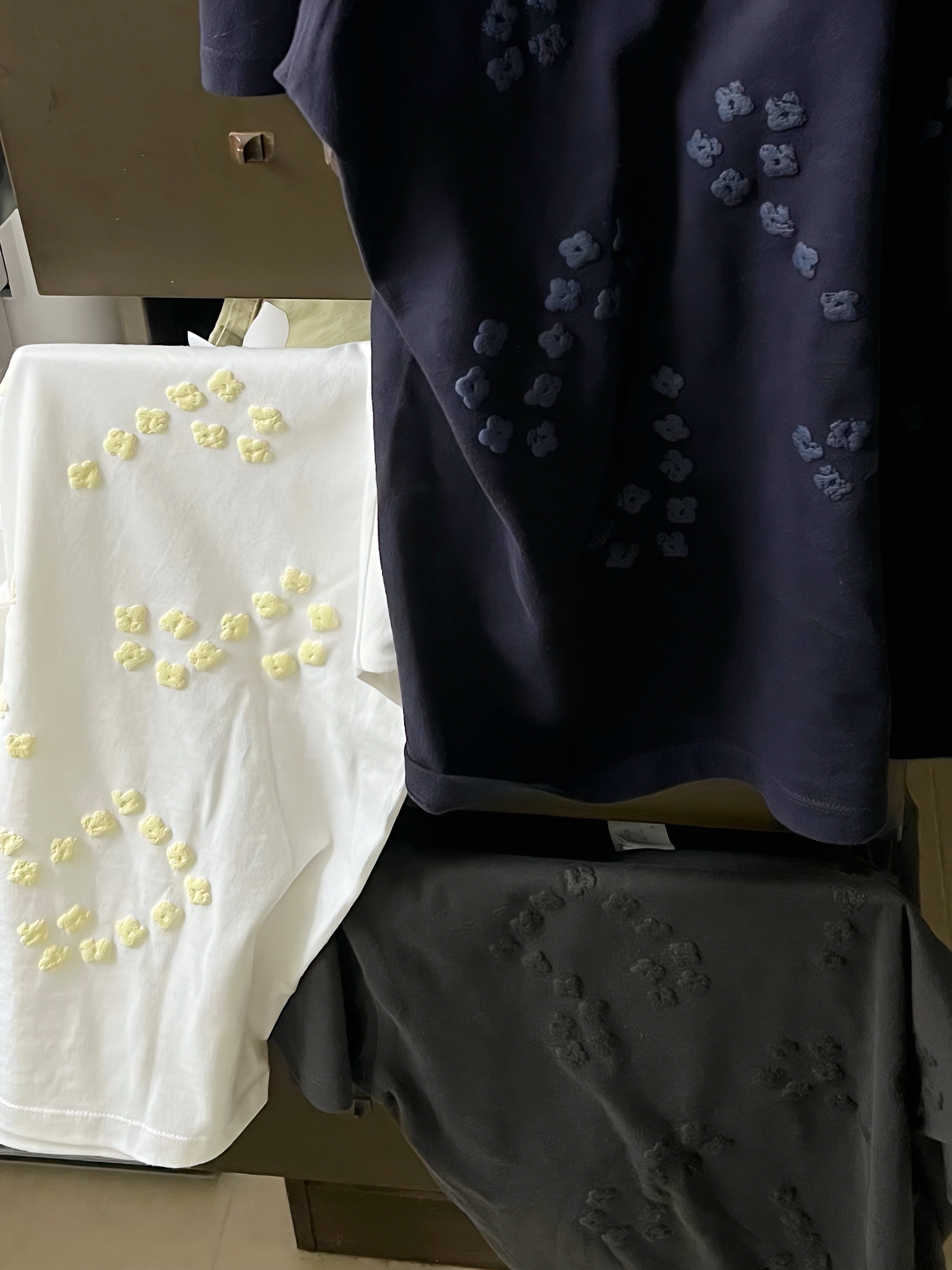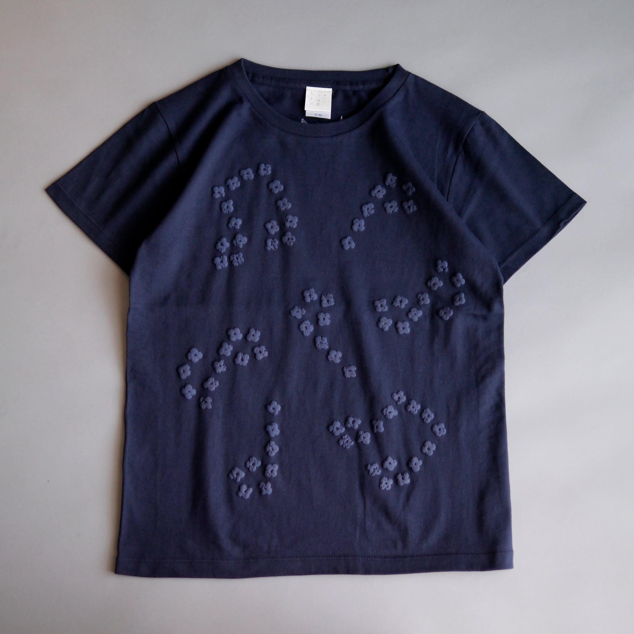 手編みで制作したお花のモチーフを、シルクスクリーンプリントで再現しています。